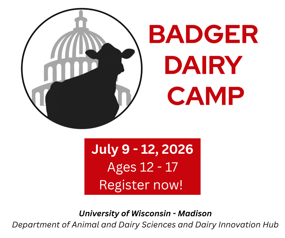 The Department of Animal and Dairy Sciences and the Dairy Innovation Hub are excited to announce the return of Badger Dairy Camp to the University of Wisconsin campus from July 9-12, 2026. The goal of this program is to educate youth about the breadth of areas that contribute to Wisconsin’s dairy industry and the higher education and career opportunities available. Our program includes hands-on workshops, tours, and recreational activities for youth ages 12-17 as of January 1, 2026.