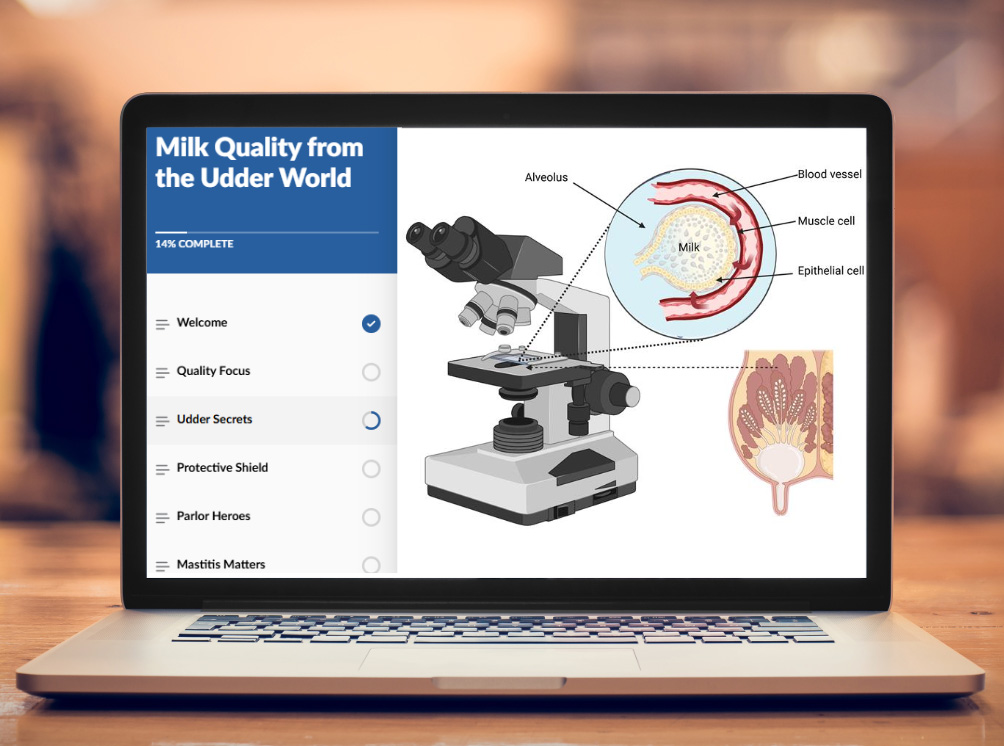 To earn your Milk Quality from the Udder World Train-the-Trainer Certification, you’ll complete a self-paced online course followed by a one-day, in-person workshop. The online course includes five engaging modules with videos, graphics, and practical content: